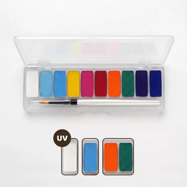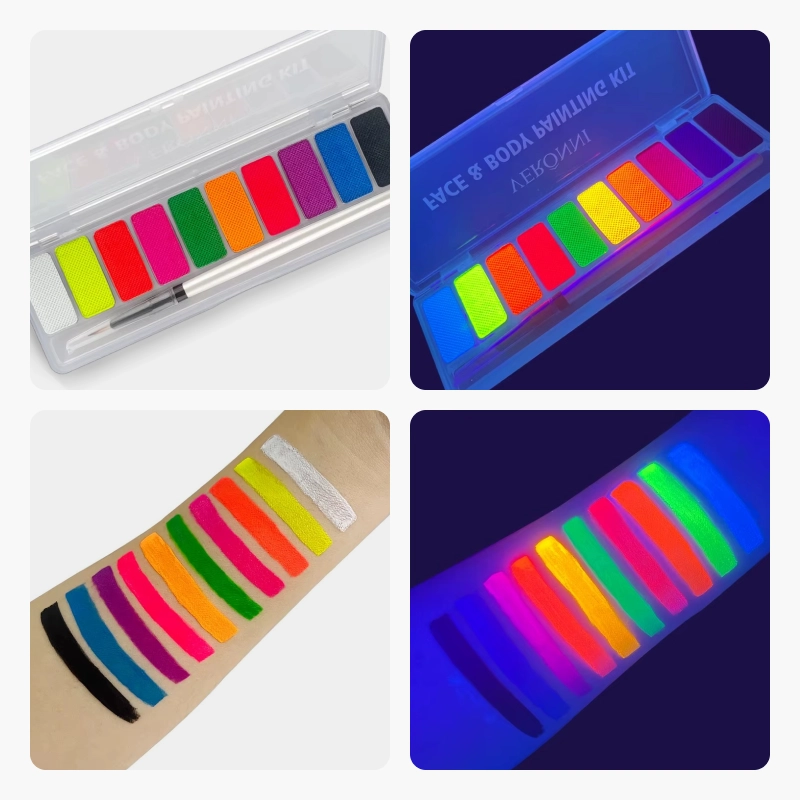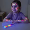 Købte dette malersæt til datters glow-fest. Farverne popp under UV-lys og nemme at tørre af igen med en våd klud bagefter.