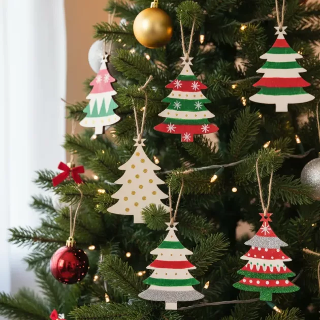Vi lavede en hyggelig eftermiddag ud af at dekorere disse ornamenter sammen. Træet føles solidt, og det er sjovt at se alles design hænge oppe.