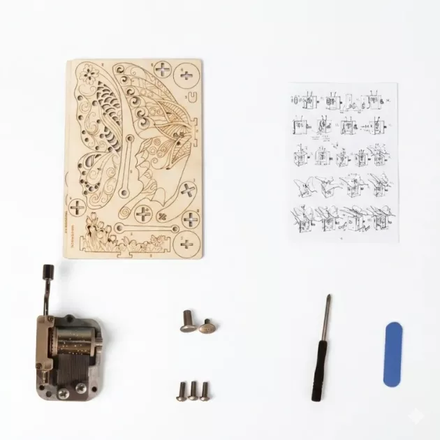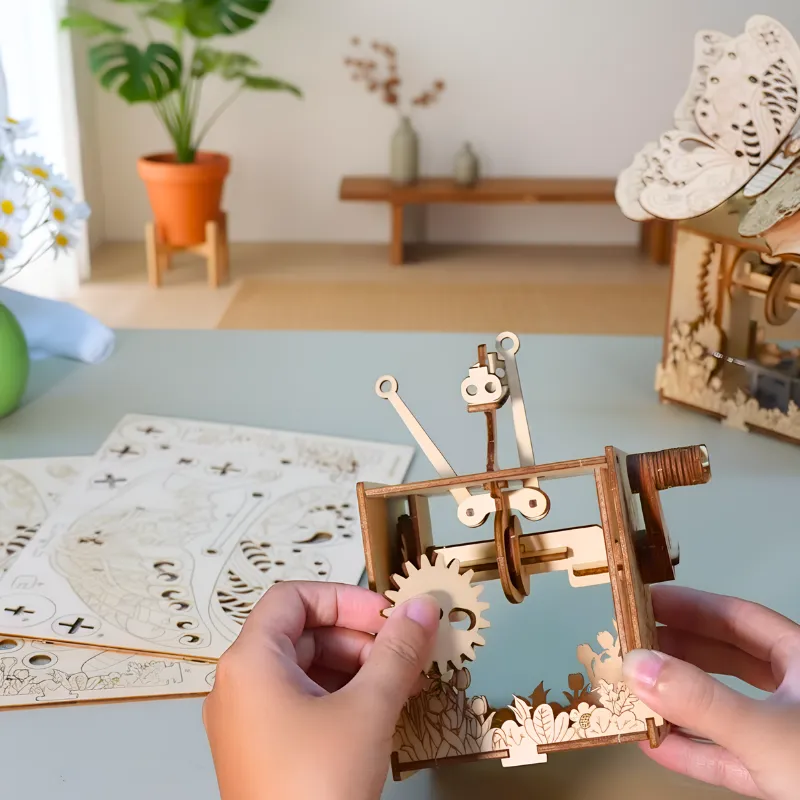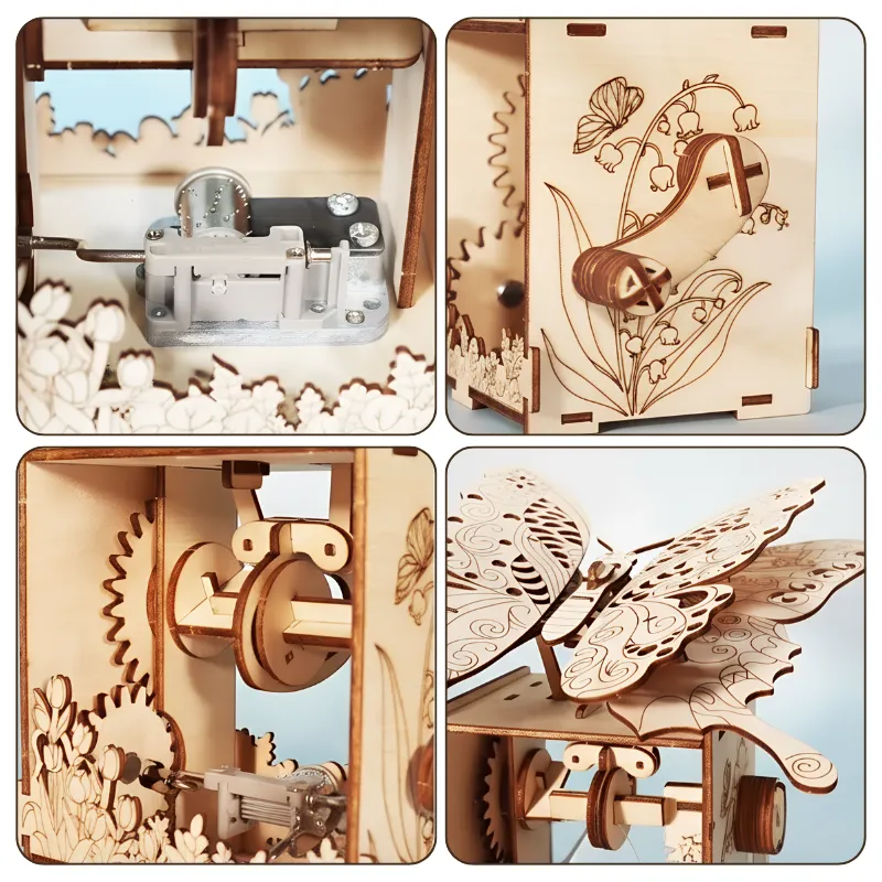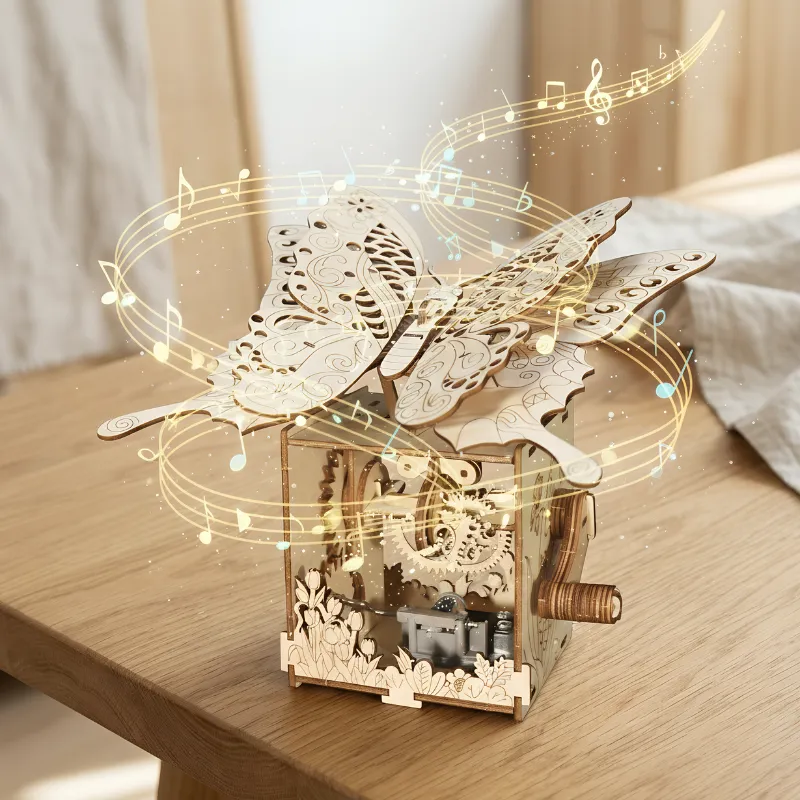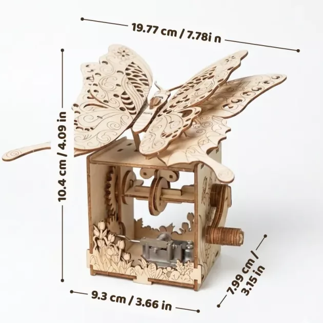 Dette træpuslespil var sjovt at samle og ser fantastisk ud. Sommerfuglen drejer rundt og spiller musik—mine venner elsker at se den til legeaftaler.