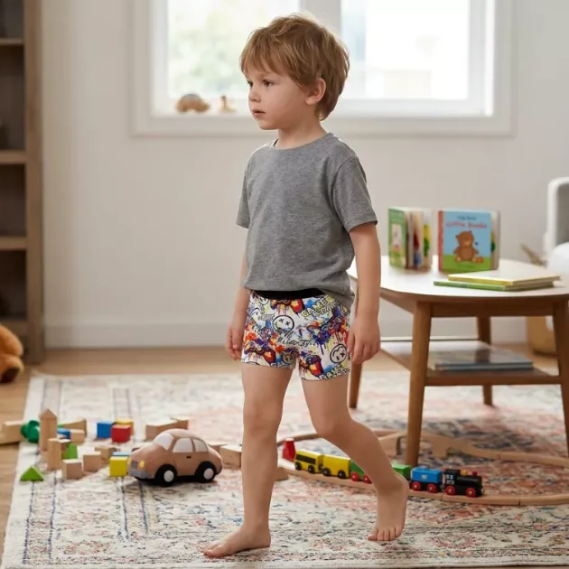 Farverige print skaber glæde i hver morgenrutine. Bløde sømme hjælper med at undgå kløe eller mærker under aktiv leg. Åndbart materiale leder sved væk og giver pålidelig komfort. Livlige designs gør det sjovt at klæde sig på hver gang.