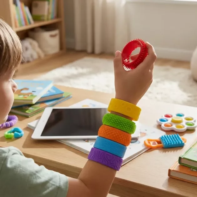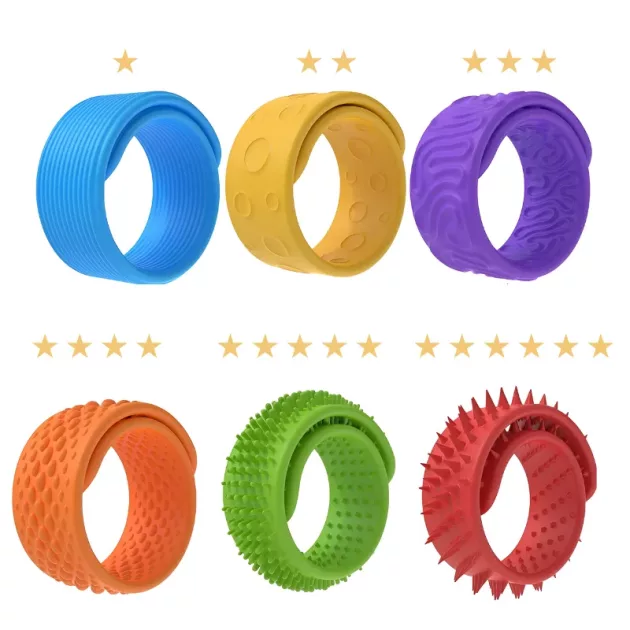 Støt nemt dit barns koncentration, uanset hvor de er. Disse farverige silikonearmbånd giver rastløse hænder en sjov og beroligende fornemmelse. Hver fleksibel del har et unikt mønster for en dejlig sanseoplevelse. Nemme at have på og sikre til daglig brug, hjælper de børn med at føle sig tilpas i travle øjeblikke.