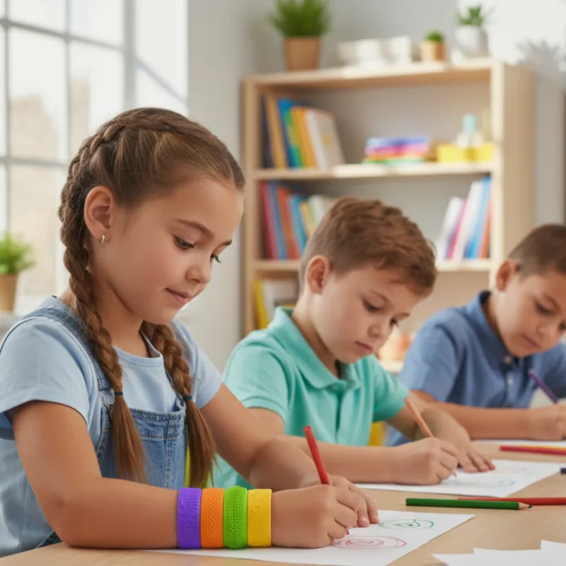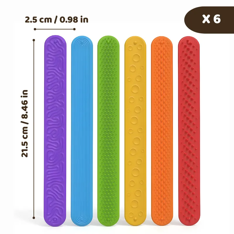 Støt nemt dit barns koncentration, uanset hvor de er. Disse farverige silikonearmbånd giver rastløse hænder en sjov og beroligende fornemmelse. Hver fleksibel del har et unikt mønster for en dejlig sanseoplevelse. Nemme at have på og sikre til daglig brug, hjælper de børn med at føle sig tilpas i travle øjeblikke.