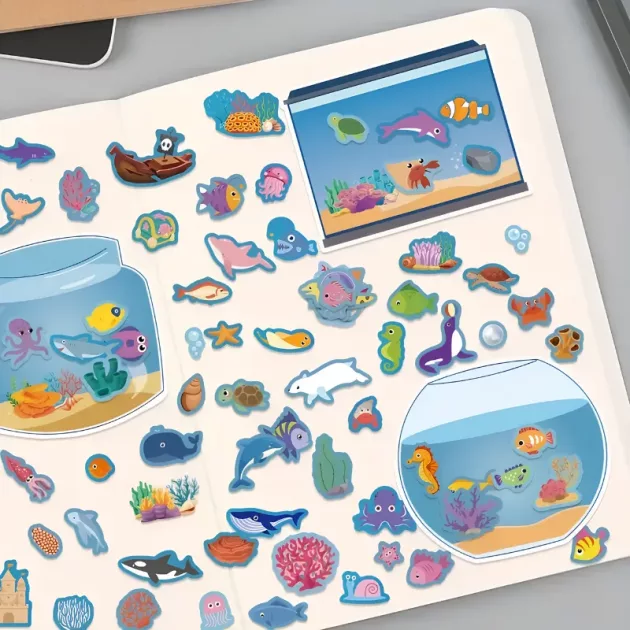 Forvandl enhver regnvejrsdag til en kreativ rejse. Farvestrålende klistermærker bringer havets magi til live. Hver aktivitet holder små hænder beskæftiget og sind inspireret. Nyd fællesskab og latter, mens dit barn bygger sit drømmeakvarium.