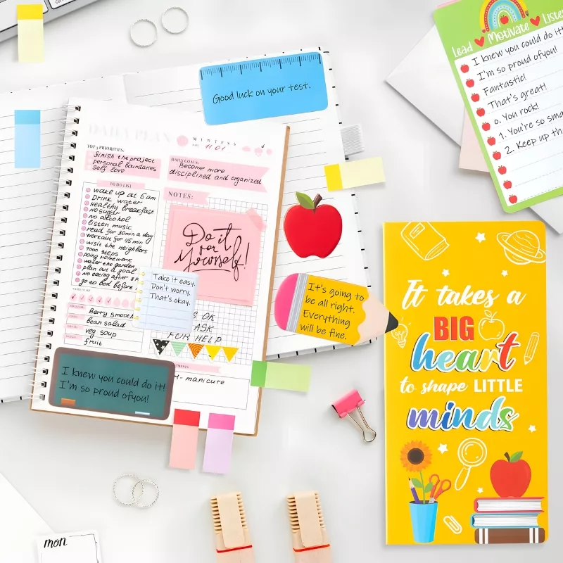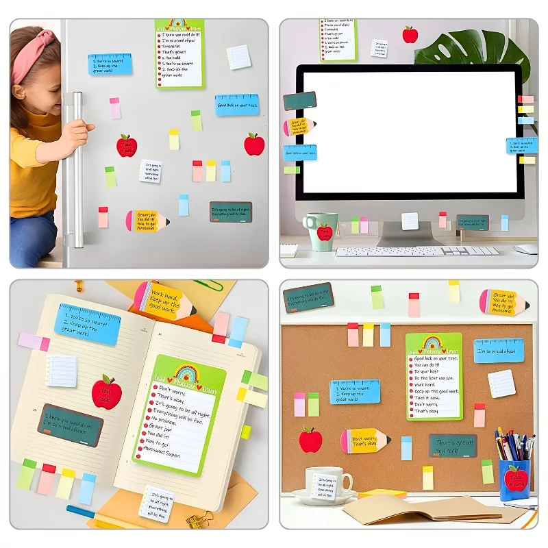 Gør hver skoledag lysere med muntre Post-it-noter. Børn vil elske at bruge forskellige former til at holde styr på idéer. Farverige designs opfordrer til kreativitet, samtidig med at de hjælper med at huske vigtige opgaver. Forældre kan stole på dette værktøj til at styrke selvtilliden og holde skrivebordet ryddeligt.