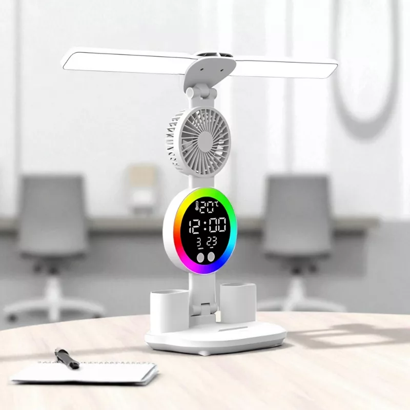 Jeg bruger lampen og blæseren hver morgen. Uret er let at se, og mit skrivebord er nu altid organiseret.