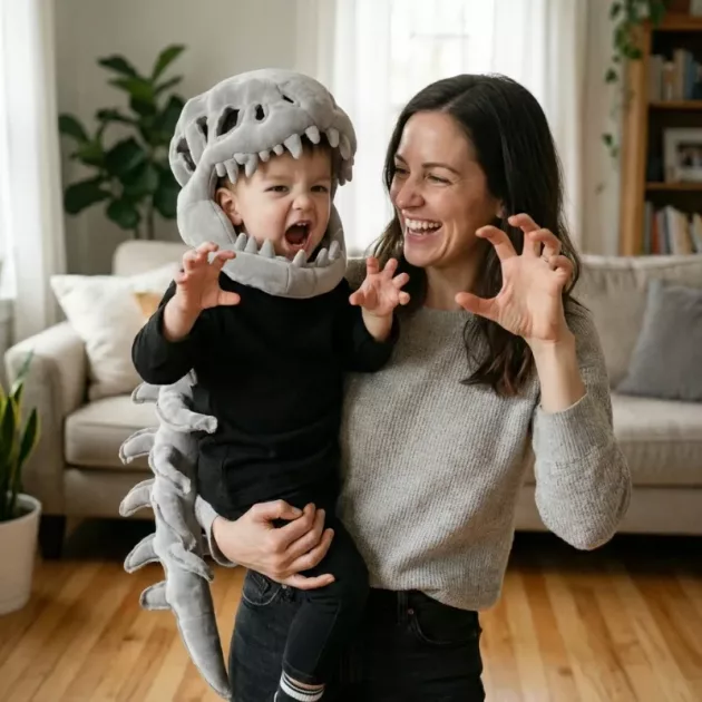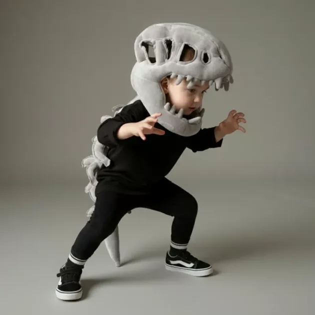 Dette dino-skeletkostume gør hverdagslegen så sjov. Jeg kan godt lide, at min søn ikke klør eller brokker sig, selv efter timer med løb.