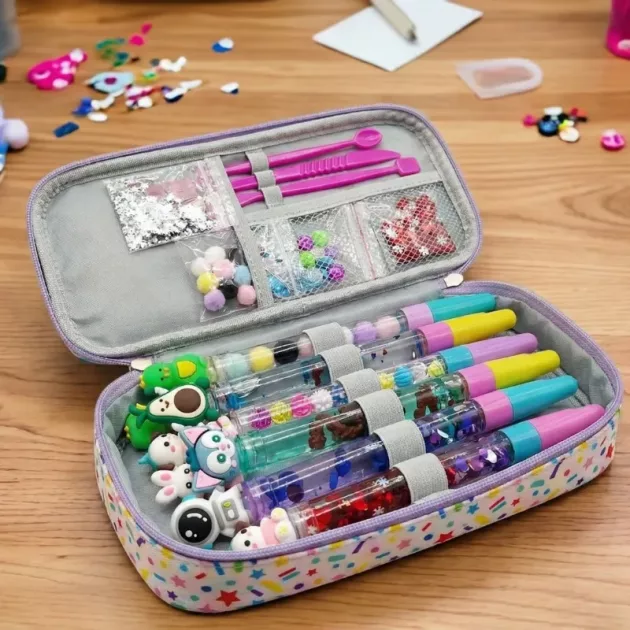 Børn elsker at lave ting, der er sjove og unikke. Dette smarte sæt lader dem designe farverige kuglepenne fulde af glimmer. At dele hjemmelavede kreationer skaber stolthed i ethvert hjem.
