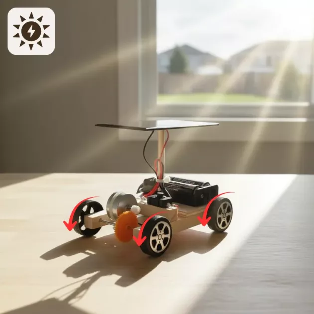 Jeg byggede solbilen med min lillebror. Han elskede at se hjulene snurre, når solen ramte panelet. Det var virkelig fedt at lære om solenergi sammen.