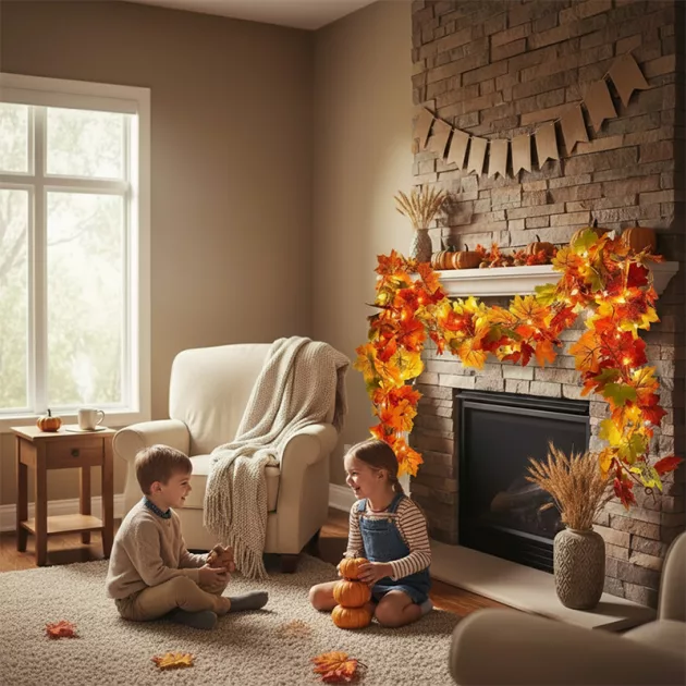 Efterårsguirlanden ser fantastisk ud i vores stue. Mine børn hjalp med at hænge den op, og det var så nemt. Føles hyggeligt og festligt hver dag!