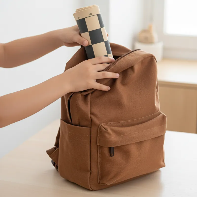 Den foldbare måtte lader mig udfordre min søster i ferien. Nem at bruge, nem at pakke væk, og mit skakspil er blevet meget bedre.