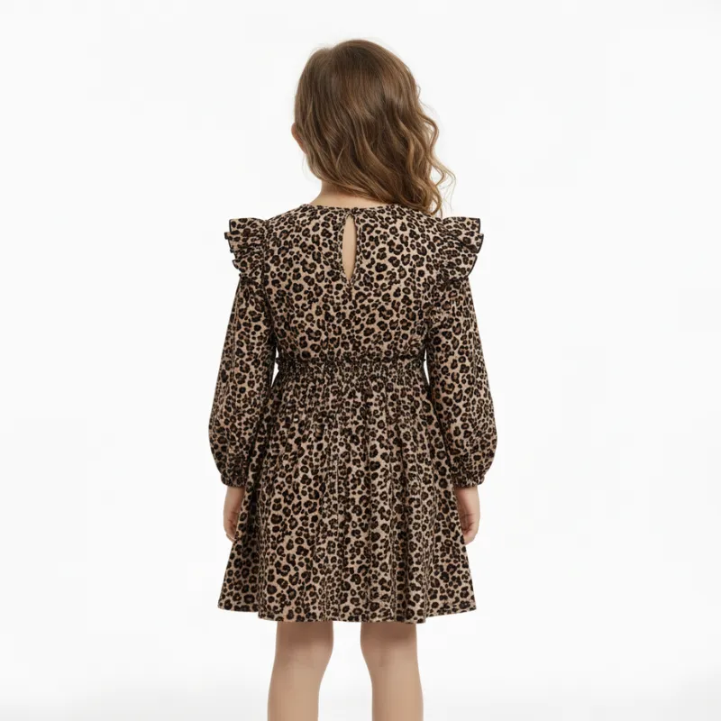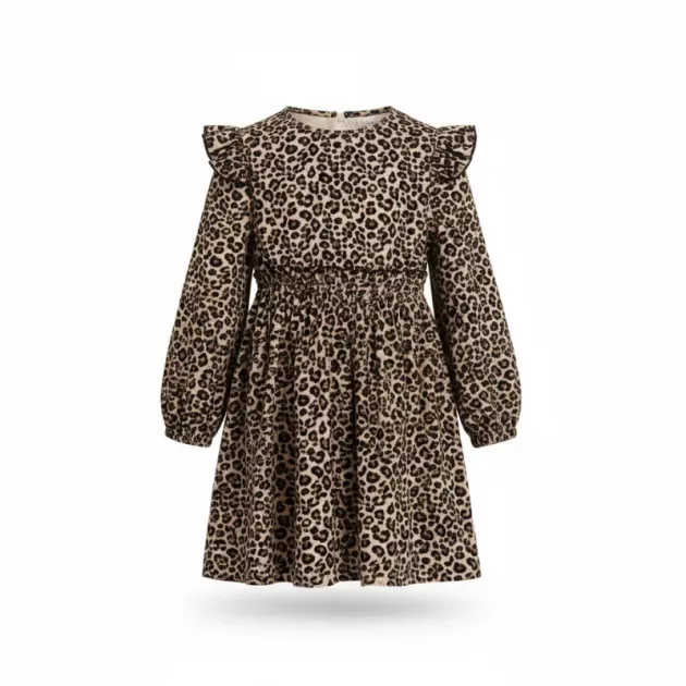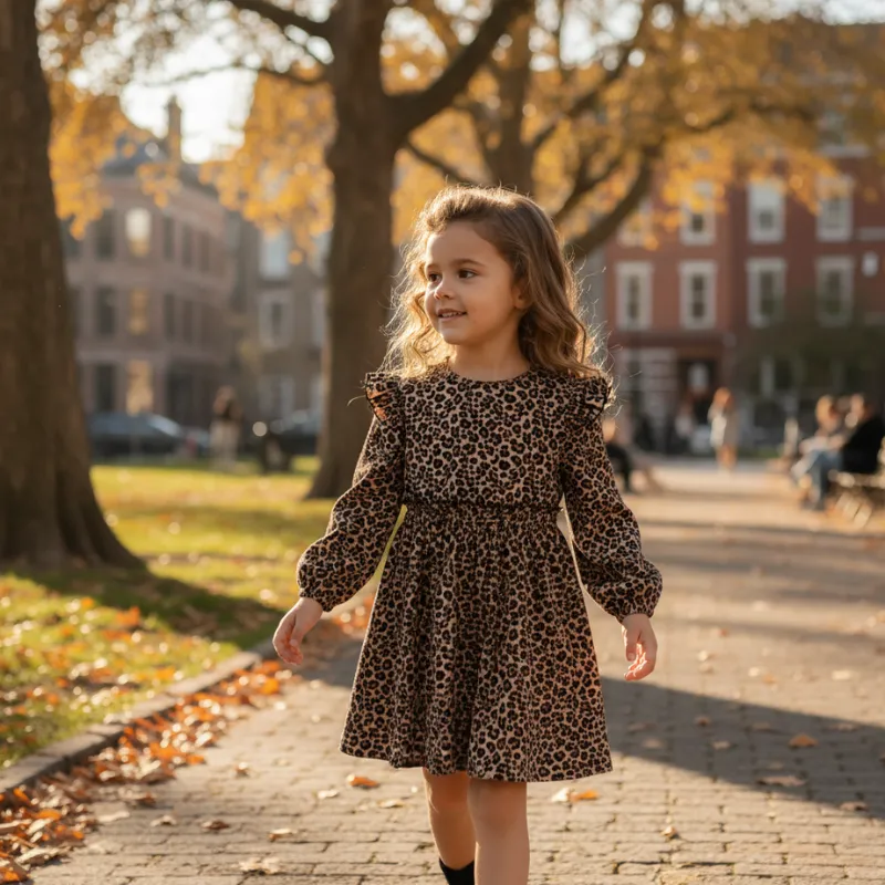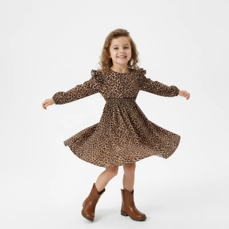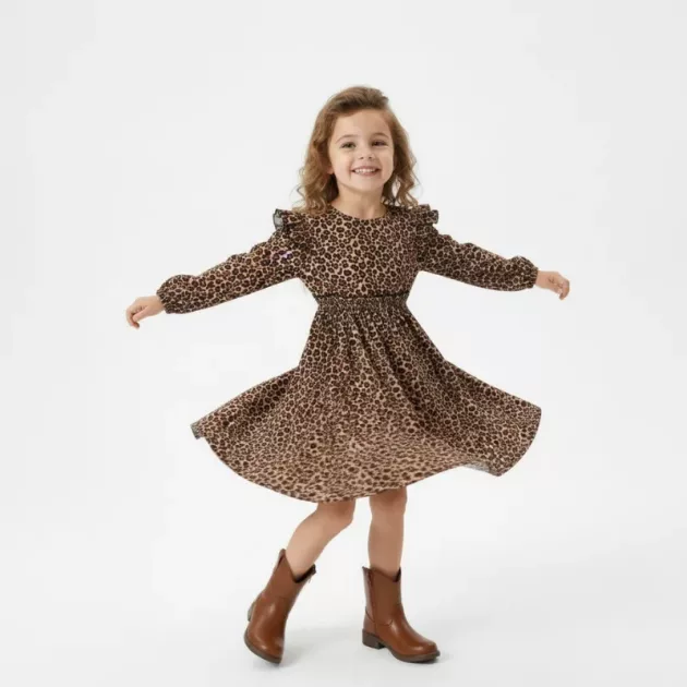 Min datter elsker denne leopardkjole! Hun drejer rundt af glæde, og den er så nem at vaske efter legeaftaler. Det farverige print får hende til at smile hver dag.