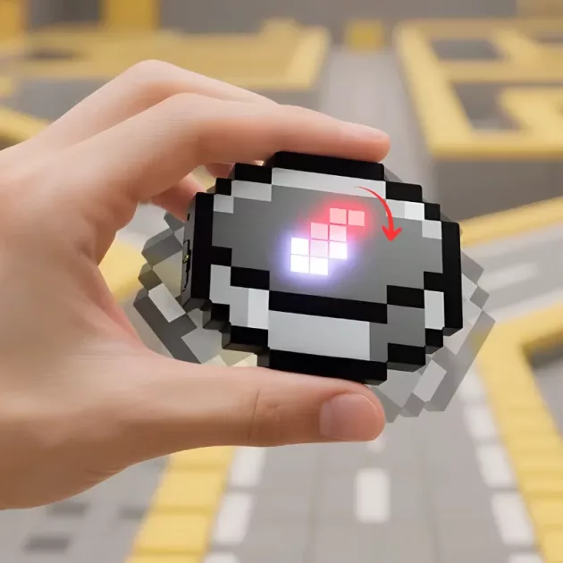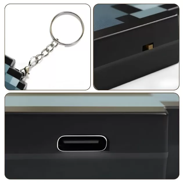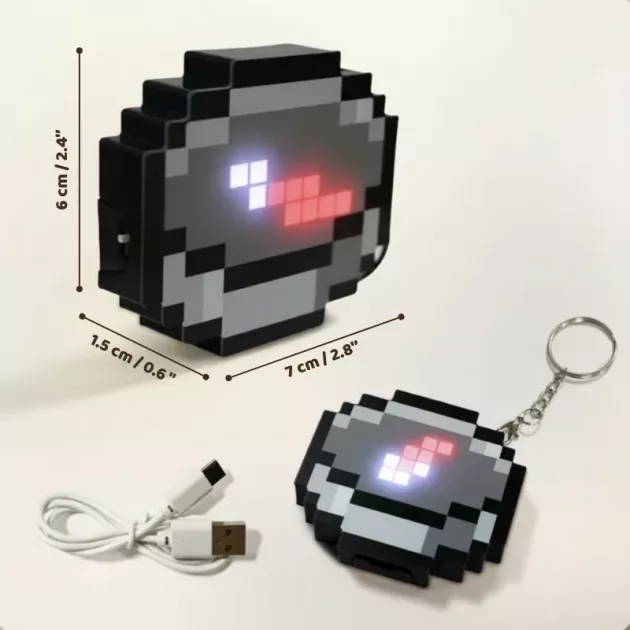 Super sødt pixel art look! Jeg har den på min rygsæk, og min lillebror vil også have en. Elsker at jeg ikke behøver at købe batterier til den.