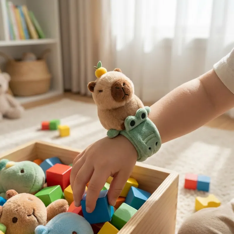 Børn overalt elsker at samle på nuttede plystilbehør. Dette snap-armbånd bringer glæde med sit bløde udseende og glade design. Det blide materiale sikrer tryghed under leg. Gør hver dag lysere ved at tilføje denne glade ven.