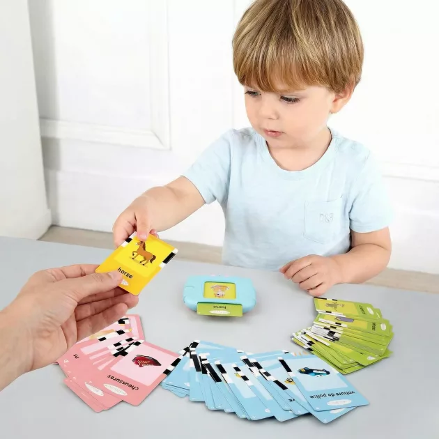 Dette legetøj har masser af kort med forskellige emner. Min datter er allerede klogere takket være det!