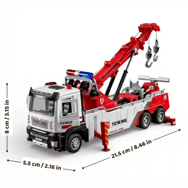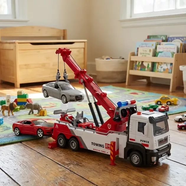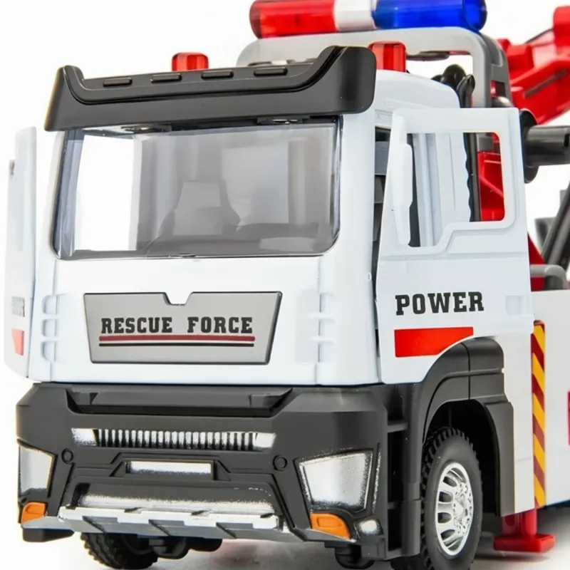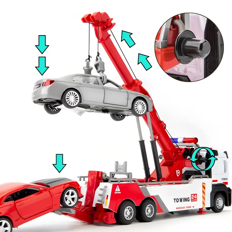 Min bror og jeg elsker at lege redning med denne slæbebil, især med de seje kroge og de klare lys. Dørene kan åbnes, og det er virkelig sjovt at bruge den!